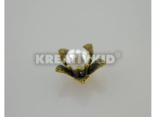 Gyöngy fém virág, 1 fűzőlyukkal, fehér gyönggyel, d:1,4cm, bronz, 10 db/csomag