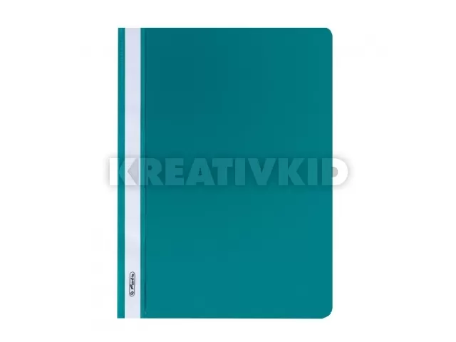 A4-es méretű iratok lefűzésére alkalmas PP gyorsfűző, feliratozható gerinccel, átlátszó fedlappal, színes hátlappal, türkiz színben.