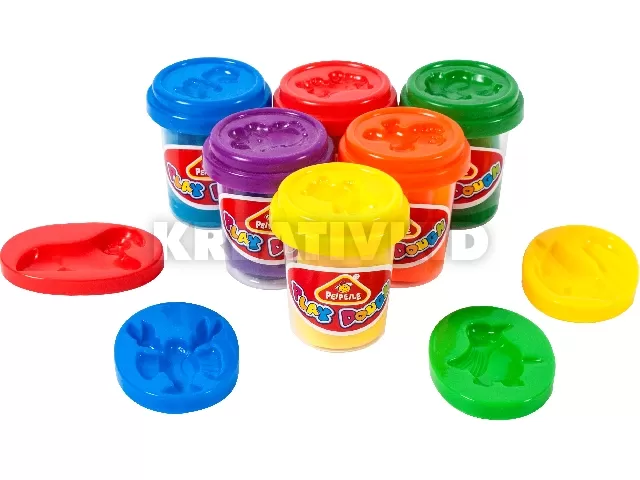 Nagy tubusokban kapható gyurma, 6 féle, különböző színű, 6 cm-es tégelyek és szaggató formák a kupakokban.