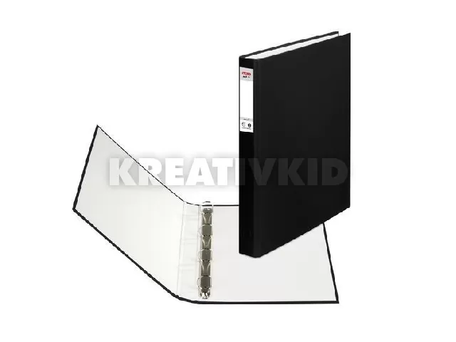 Gyűrűskönyv A4-es méretű iratok tárolására, ragasztott címkével, kívül PP borítással, karton belsővel, 4 gyűrűvel, 2,5 cm-es gerincvastagsággal, fekete színben. Különösen nagy igénybevételre kifejlesztve, 10 év garanciával a mechanikai szerkezetre.