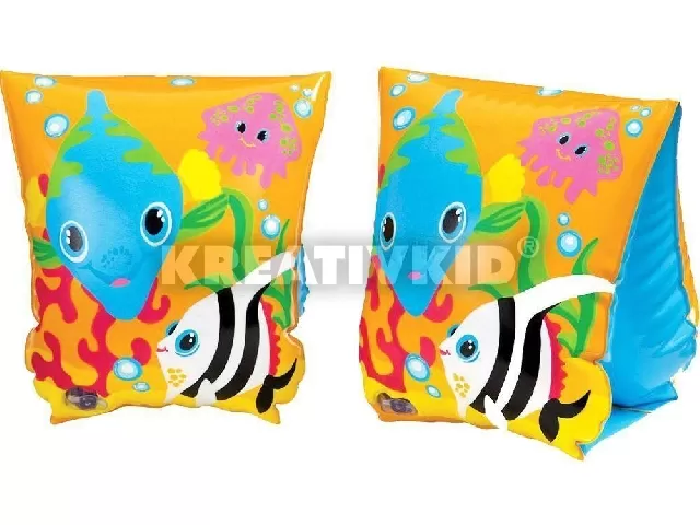 Sajátítsd el az úszást színes halakkal! A sárga felfújható karúszók segítenek, hogy megtanuld az úszás alapjait, és ne süllyedj el a medencében. A Halacskás karúszó biztonsági szeleppel van felszerelve, amin keresztül egy-két fújással fel tudod tölteni levegővel. Felfújt méretek: 23 x 15 cm.