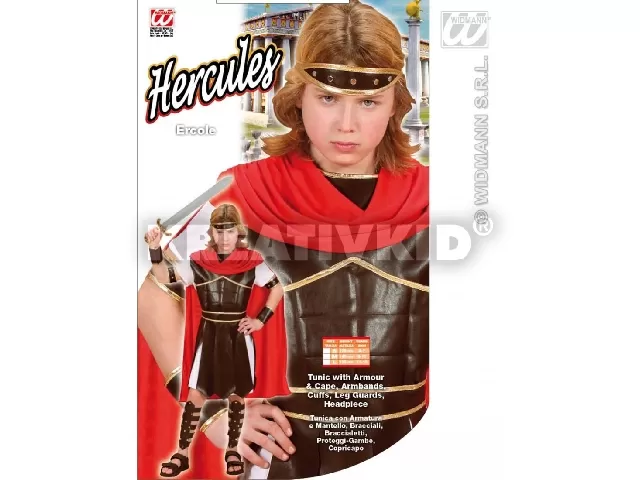 A római mitológia Herkulesére, mint az egyik legnagyobb hősre tekinthetünk, akinek életét, kalandjait számos alkotás dolgozta már fel. Keltsd életre a halhatatlan hőst, s nyűgözz le mindenkit a jelmezbálon! A jelmez páncélinge áll egy barna, felül izomhatású, alul rojtos páncélzatból, és a hozzá tartozó fehér ingből. Az egybevarrt ruha térd fölött ér véget, a derekán övvel megköthető. A vörös palást, a lábszárvédő, a karperecek és a fejpánt különösen hatásossá varázsolják a szettet.