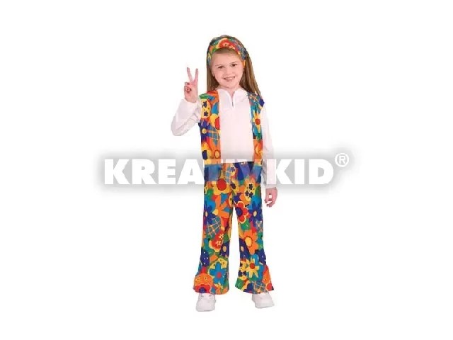 A Rubies jó minőségű jelmezeinek tárából a hippi kosztüm rendkívül színes, vidám és bolondos, virágokkal gazdagon díszített. A kényelmes viselet a farsangi bálon is praktikus, hiszen a kislányt nem zavarja a játékban. A nadrághoz mintában passzoló mellény társul, amely egybevarrt a fehér felsővel. A szettet a hajpánt teszi teljessé.