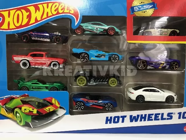 Hot Wheels 10 darabos kisautók játékszett: A kollekcióban találhatunk sportautót, versenyautót, vagy akár kétüléses sportautót is. A kisautók mérete 7-8cm.