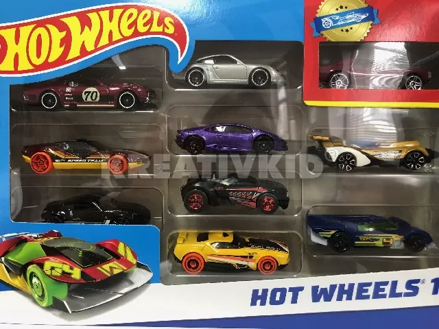 Hot Wheels 10 darabos kisautók játékszett: A kollekcióban találhatunk sportautót, versenyautót, vagy akár kétüléses sportautót is. A kisautók mérete 7-8cm.