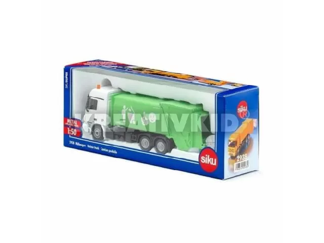 1:50 méretarányú Mercedes-Benz kukásautó a Sikutól. A járgány fém és műanyag felhasználásával készült, egyes részei mozgathatók.