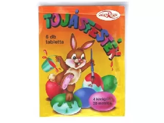 Húsvéti tojásfesték készlet, tartalma: 6 különböző színtabletta, 4 kivágóív, 20 matrica