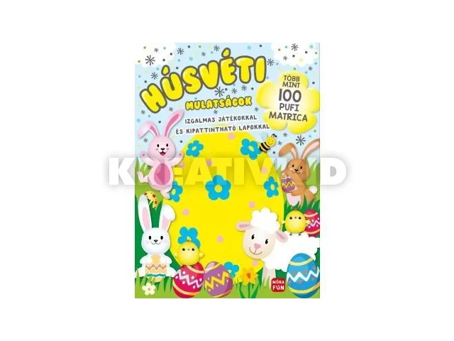 Készülj, várnak a mókás tavaszi játékok! Vezesd a tojásokhoz a húsvéti nyuszit, színezd ki a pelyhes kiscsibéket, és pattintsd ki a lapokból az aranyos húsvéti pajtásokat. A 100 pufi matricát ragaszd, ahová csak akarod! Ugorj rá!