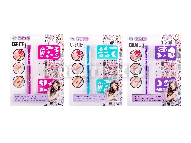 Dekoráld magadat illatozó ideiglenes tetoválásokkal! Az Illatos tetováló toll matricákkal csomagban csillámos tintával feltöltött, különleges zselés tollat találsz, amivel a bőrfelületre lehet szép tetkókat készíteni. A sablonokkal meg tudod adni, milyen legyen a minta, amit utána a tollal tudsz megrajzolni, és ékkövekkel is díszíthetsz. A tollak kellemes illatot árasztanak magukból, és ha meguntad a tetkót, könnyen le tudod mosni magadról. Az Illatos tetováló toll matricákkal készlet 1 darab tollat, valamint sablonokat, díszítő elemeket is magában foglal. Csomagolás méretei: 15 x 21 cm. A játékok külön kaphatóak.
