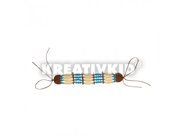 Az univerzális, egy méretben kapható indián karkötő kiváló kiegészítője lehet az indián jelmezednek, de bármely különleges öltözéknek. Az egyedi ékszer 4 sor gyöngyből áll és madzagokkal a végén.