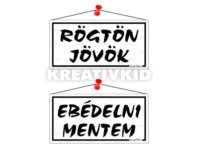 Információs tábla, 20x10,5 cm, kétoldalas, "Rögtön jövök/Ebédelni mentem", fehér