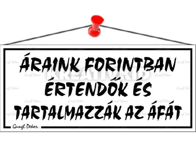 Információs tábla, 22,5x10 cm, "Áraink forintban értendők és tartalmazzák az áfát", fehér
