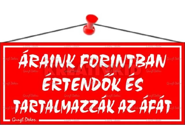 Információs tábla, 22,5x10 cm, "Áraink forintban értendők és tartalmazzák az áfát", piros