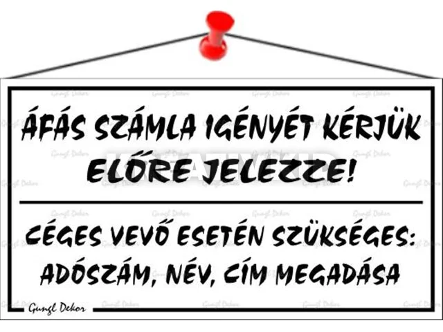 Információs tábla, 22,5x12,5 cm, "ÁFÁS számla igényét kérjük előre jelezze!", fehér