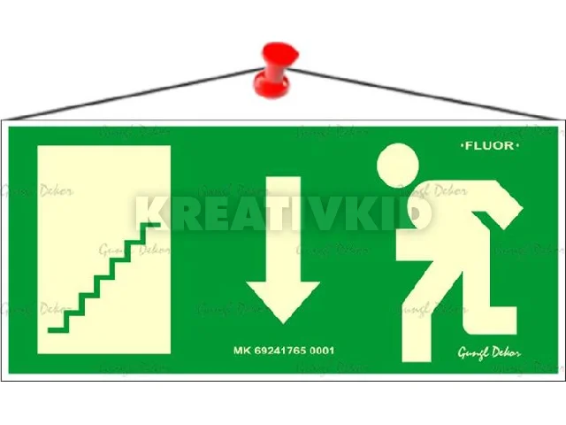 Információs tábla, 25x11,5 cm, fluoreszkáló, utánvilágítós, "Menekülési irány le, lépcső balra"