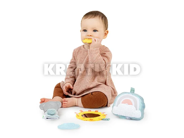 - Az ötrészes készlet háromféleképpen foglalkoztatja a baba érzékeit: a zenélő plüssjáték gyengéd hangokkal nyugtat meg, a rágóka kesztyű és a rágóka enyhülést hoz a fájós ínynek, a napostükör címkékkel pedig megnyugtató felfedezést kínál