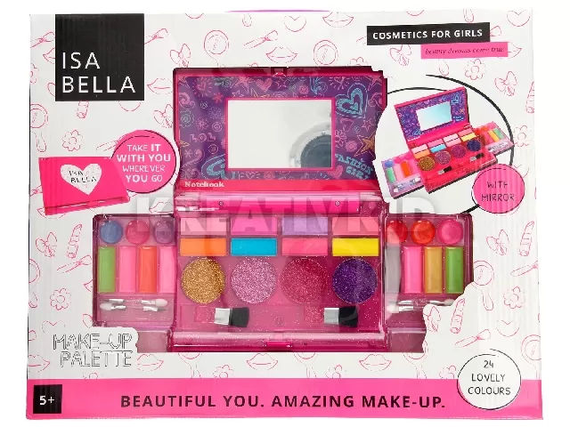 Váltsd valóra szépítkezési álmaidat az Isabella smink készlettel! Az Isabella smink készlete kiváló szórakozás lesz minden kislány számára. A 24 színből álló sminkpaletta csak arra vár, hogy kipróbáld őt. Rózsaszín, lila, kék vagy narancs? A készlet széles színpalettával vár Téged gyönyörű sminkek elkészítésére. A kozmetikumok között találsz szemhéjpúdert és színes szájfényeket is. Használd az ecsetet és vidd fel arcodra a mesés színeket. A készletben található tükör segít, hogy könnyebben el tudd készíteni a sminkedet. A praktikus csomagolásnak köszönhetően bárhová magaddal viheted trendi felszerelésedet. Használd a fantáziádat és készíts magadnak és barátnőidnek mesés szemsminkeket, csillogós szájfénnyel megkoronázva. Valódi szórakozásban lesz része minden sminkkedvelő fiatalnak. A készlet tartalmaz színes szájfényeket, szemhéjpúdereket, 2 db ecsetet és egy tükröt.