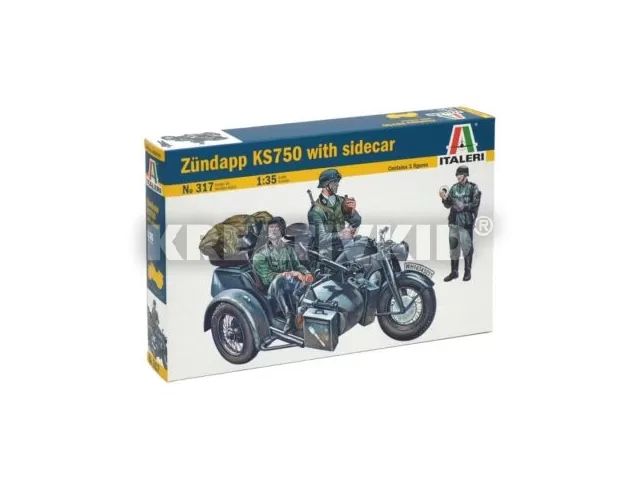 1:35 méretarányú műanyag motorkerékpár makett. A Zündapp KS750 egy II. világháborús német oldalkocsis motorkerékpár, amelyet a német Wehrmacht számára fejlesztett ki a második világháború idején a szintén német Zündapp GmbH cég. Miután 1941-ben szolgálatba lépett, az összes nagyobb német harctéren megfordult, és különféle szerepekben használták. Az oldalkocsira gyakran szereltek MG34 vagy MG42 géppuskát.