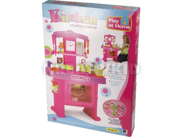 Főzz varázslatos ételeket a rózsaszín kiskonyhában! A rózsaszín Játékkonyha hanggal és fénnyel egy kezdő szakácsoknak készült műanyag főzőstúdió, rengeteg kiegészítővel! A tűzhely főzőlapjai világítanak és sütéshangokat adnak ki magukból, a konyha mosogatóval és polcokkal is fel van szerelve. Sajátítsd el a főzés alapjait, készítsd el a legjobb ételeket! A rózsaszín Játékkonyha hanggal és fénnyel lábosokat, eszközöket és tányérokat is tartalmaz. Összerakott méretek: 42 x 63 cm.