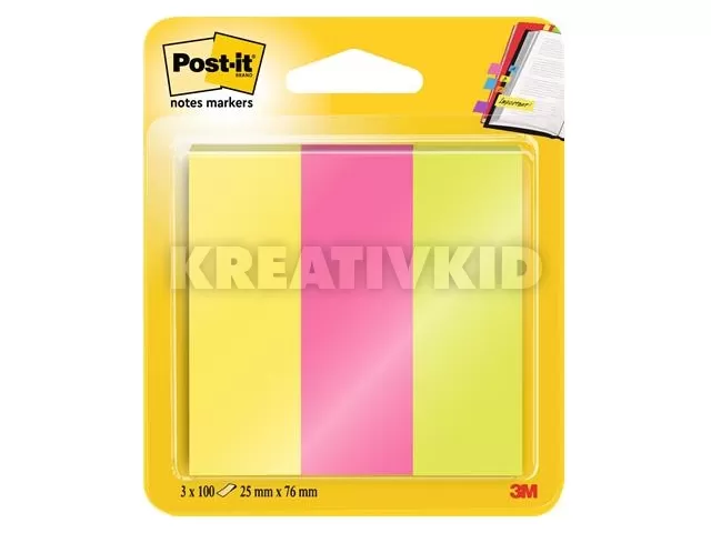 Jelölőcímke, papír, 3x100 lap, 25x76 mm, 3M POSTIT, vegyes neon színek
