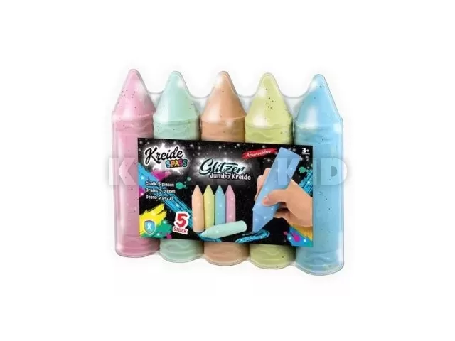 Jumbo csillámos aszfaltkréta szett, amely 5 darab csillámos krétát tartalmaz. A nagy méretű kréták könnyen foghatók, valamint nem tartalmaznak toxikus anyagokat.
