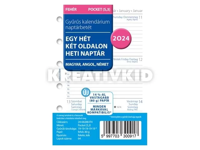 Kalendárium betét, tervező, Filofaxhoz, pocket méret, heti, 1 hét/2 oldal, 2024
