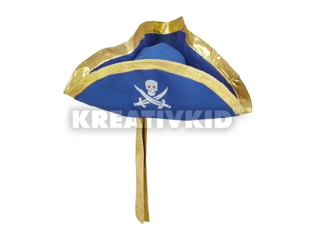 Kék színű, arany szalaggal és fehér halálfejjel díszített kalózkalap a Widmann kínálatából.