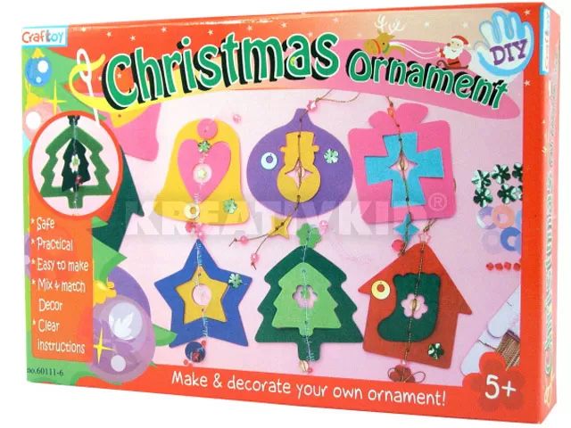 A csomag tartalmából 6 db színes, dekoratív dísz készíthető. A formák ki vannak vágva, a szükséges helyeken lyukasztva. A könnyű filc anyagú diszekkel dekorálhatjuk a karácsonyfát, ablakokat, vagy akár a csillárról is lelógathatjuk.
