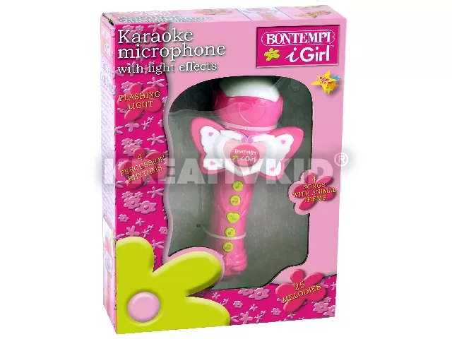 A Bontempi karaoke mikrofonja a dalos kedvű kislányok kedvence lesz.Ez a gyerek-kezekbe szépen illeszkedő divatos kis mikrofon 25 féle dalt tud lejátszani, 4 állathangokból felépülő dallamot és 4 féle ritmust, ahol az ütős hangszereké a főszerep. A fény-effektek adják a ráadást.