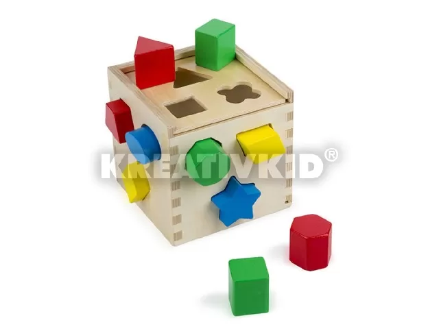 A kocka alakú tárolóba az adott nyílásokon keresztül adott formák helyezhetőek el. Ezt megtanulva a kicsik játszva fejlődhetnek.