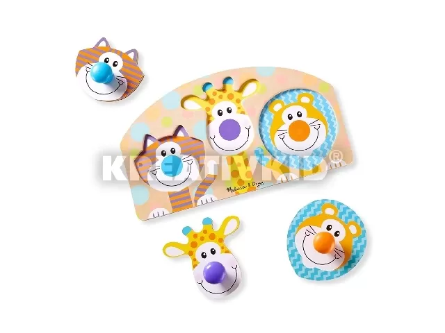 A fa lapon 3 állatka feje látható, melyek mindegyikének közepén egy fogantyú található, ezáltal a puzzle darabjait egyszerűen meg tudod ragadni. Ezek az elemek csakis saját helyükre tehetők vissza.