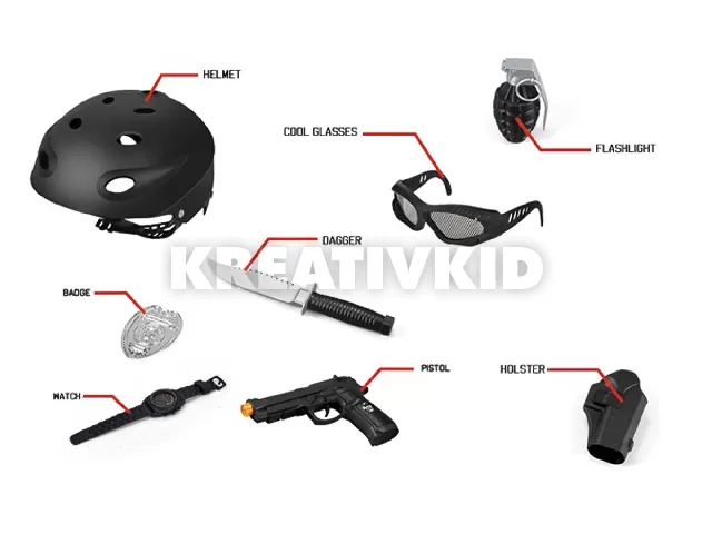 A szett tartalma: sisak, gránát, jelvény, pisztoly, pisztolytáska, kés, szemüveg, óra.