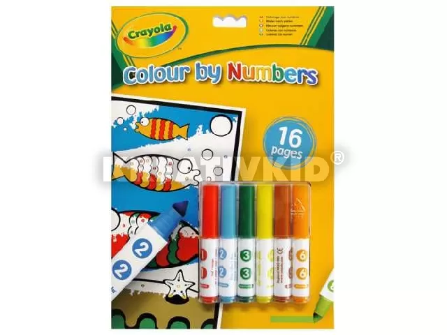 16 oldalas Crayola kifestő 6 különböző színű, mosható és beszámozott filctollal. A kifestő lapok különböző színű elemein olyan számok szerepelnek, amilyen színnel javasolt kifesteni. A lapok perforált szélének köszönhetően, könnyen leválaszthatók a füzetből. Ajánlott 3 éves kortól.