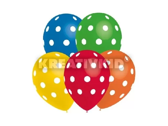 Léggömb Confetti pöttyös, héliummal tölthető, átmérője 23-25 cm, 6 db/bliszter, vegyes színekben.