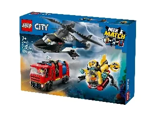 A LEGO® City Tűzvédelmi teherautó (60374) készletben található tűzoltóautó egy levehető irányítóközpontot, valamint egy tűzoltó és egy szárazföldi dró...