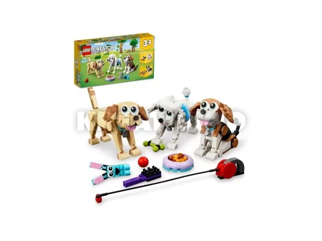 A LEGO® Creator 3 az 1-ben Cuki kutyusok (31137) szett egy beagle-t, uszkárt és labradort tartalmaz beállítható fejjel, farokkal és füllel, valamint olyan kiegészítőket, mint a kutyatál, kefe, játék nyúl, labda és kutyasétáltató póráz, amik extra szórakozást csempésznek a gyerekek történeteibe.