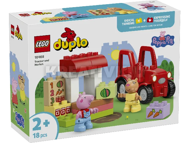Segítsd a kisgyerekeket kreativitásuk fejlesztésében a Peppa malac Traktor és piac (10468) építőjátékkal! A 2 éves és idősebb kisgyerekek elmerülhetnek a fantáziadús játékban, amikor játékból a farm kisboltját vezetik, és azt LEGO® DUPLO® építőelemekkel töltik meg, amelyeket eladható élelmiszerekkel díszítenek. A fantáziadús játék Pedro póni és Peppa malac figurákkal, egy vezethető piros traktorral, valamint sárgarépa, görögdinnye és lekvárosüveg kockákkal érkezik. Ez a kisgyerekeknek készült oktatójáték rengeteg fejlődési lehetőséget kínál. A sorozat jeleneteinek megfigyelésével és utánozásával javíthatják kognitív képességeiket, például a problémamegoldási készségeiket és a memóriájukat. A kis építők finommotoros képességeiket használják a traktor és az istálló megépítéséhez. A készletben egy görögdinnyével, sárgarépával és lekváros üvegekkel díszített menü található. A kisgyerekek gyakorolják a számok felismerését és párosítását, miközben megtalálják a megfelelően díszített elemeket. A készlet 18 elemet tartalmaz.
