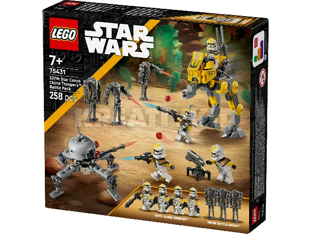 Ebben a gyerekeknek szóló LEGO® Star Wars: A Sith-ek bosszúja harci csomagban (75431) megépítheted a 327. Csillag Hadosztály klónkatonáit, és megküzdhetsz a szuper harci droidokkal! A szett tartalmaz 4 klónkatona LEGO Star Wars minifigurát (a 327. Csillag Hadosztály ikonikus egyenruhájában) és 3 szuper harci droid LEGO figurát. Ebben a megépíthető Star Wars játékkészletben egy AT-RT lépegetőt is találsz: fülkéjébe egy LEGO minifigura fér, korongvetőkel van felszerelve, rendelkezik tárolórésszel a sugárvetők és a távcső számára, és található rajta egy lövegtorony is, amit a klónkatonák használhatnak. A szuper harci droidok pedig egy pókdroiddal színesítik az izgalmas ütközeteket.