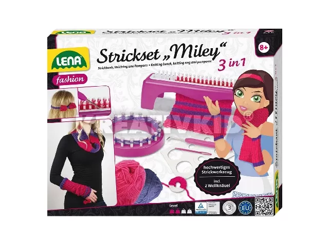tartalma: kötőpad, kötőgyűrű, kötőtű, tomta hegyű tű, 2db pamut gombolyag, pompom készítő sablon