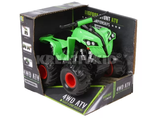 Modern megjelenésű kaszkadőr quad, cserélhető külsővel! A Bigfoot Stunt motor egy négykerekű, vagány megjelenésű járgány, ami a legnehezebb tereppel is könnyen megbirkózik. A quad karosszériája cserélgethető, a gumírozott kerekekkel a motor simán tud haladni, ha megtolod, a lendkerék messzire fogja vinni a járművet. A motor kisebb emelkedőkön is fel tud gurulni. A Bigfoot Stunt motor méretei: 12 x 10 x 10 cm.