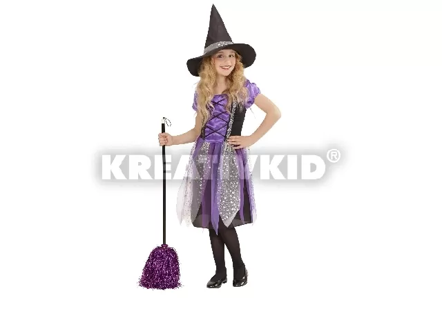Lila-fekete csinos boszi jelmez csillogós mintákkal, 140-es méretben a Widmann jelmezforgalmazótól.