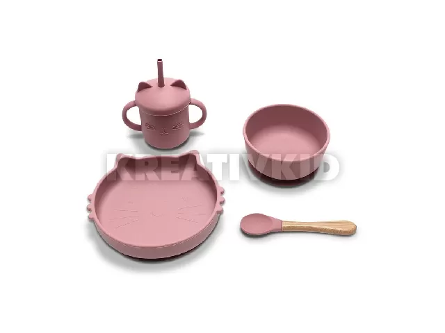 - 4 részből álló szett: 1 db etetőtál, 1 db kanál, 1 db itatópohár, 1 db tányér