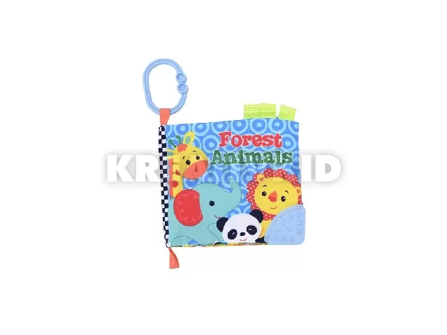 - A könyv textil anyagból készült, különböző állatokkal az oldalakon. Az első oldal sarkában egy rágóka található, amely segít a gyermeknek megnyugtatni az ínyét.