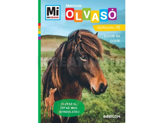 Felhő, a csikó kedvenc állatairól, a lovakról mesél. A feladványokkal ellenőrizheted, hogy olvasás közben mindent jól értettél-e. Fejtsd meg a csalafinta rejtvényeket, és keresd meg a matricák helyét!Egyszerű szövegek kezdő olvasóknak. A fejtörők segítik a szövegértést. Gyakorlás közben javul az olvasási készség.Olvasói célcsoport: 13. osztályA Mi MICSODA Olvasó Lovak és pónik kötetét kiegészítő vagy önállóan is használható foglalkoztató. Felhő, a csikó vezeti az olvasókat. Az oldalpárba rendezett, rövid ismeretterjesztő szövegeket változatos rejtvények és a szövegértést segítő feladatok követik.Hány lófajta létezik? Mire használják a melegvérűeket, a hidegvérűeket, a telivéreket és a pónikat? Milyen a lovak testfelépítése? Miből tudhatod, hogy érzi magát a lovad? Milyen színűek lehetnek a lovak? Milyen jármódokat tudnak a lovak? Milyen lovassportok vannak?