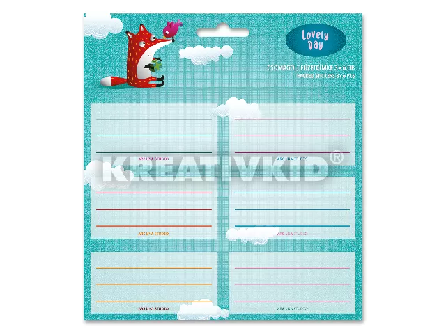 Öntapadós papír füzetcímke, egy csomagban különböző mintákkal. 3 ív x 6 db, összesen 18 db található. Felakasztható fejléccel.