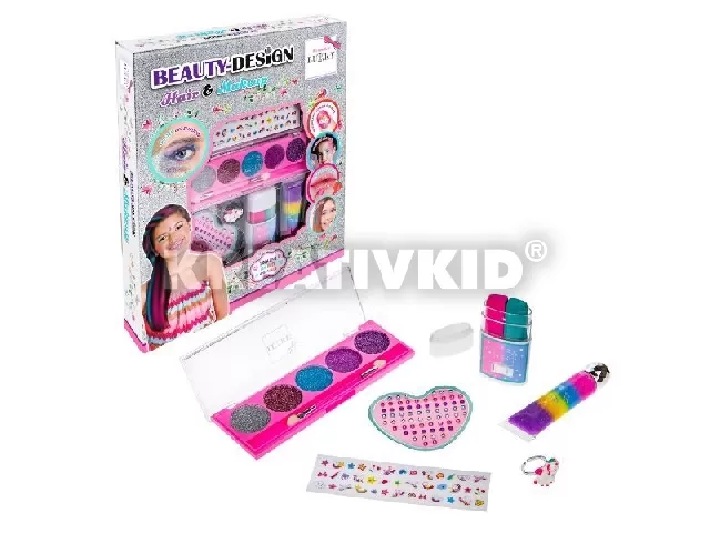 A Lukky manikűr, smink és hajszínező készletével a lányok egyszerűen és gyorsan varázsolhatnak maguknak csodálatos és egyedi megjelenést. A szett különböző színű, csillámos szemhéjzseléket, eper illatú szájfényt, applikátort, 2 az 1-ben hajszínező krétát sok-sok körömmatricát és díszítő köveket tartalmaz. Ajándék unikornis gyűrűvel.