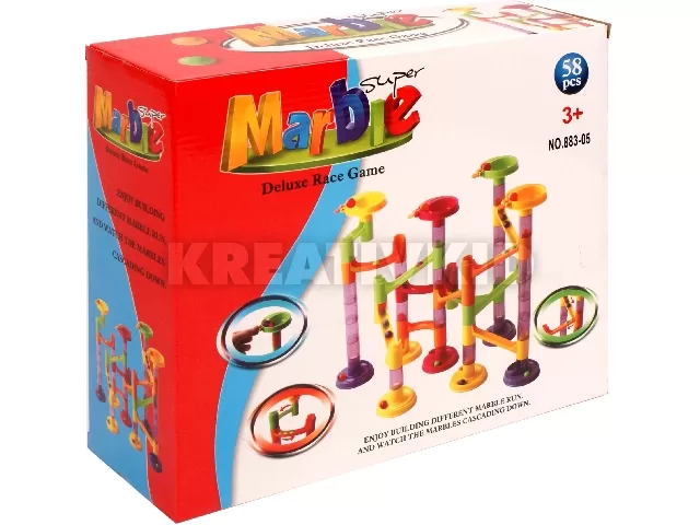 Építs egy látványos pályát, amin a golyók gurulhatnak! A Marble 58 darabos műanyag golyópálya15 színes golyóból és 43 alkatrészből áll, amikből egy több emeletes és oszlopos, magas pályát tudsz összerakni. A golyókat a pálya tetejéről kell indítanod, és a lejtőkön, csövekben haladva végül a pálya alján fognak kikötni! A pálya összerakása nagy mértékben fejleszti a térlátást és a kézügyességet is, némi gyakorlással már kifejezetten bonyolult pályákat is össze fogtok tudni rakni! A Marble 58 darabos műanyag golyópálya csomagolási méretei: 29 x 10 x 25 cm.