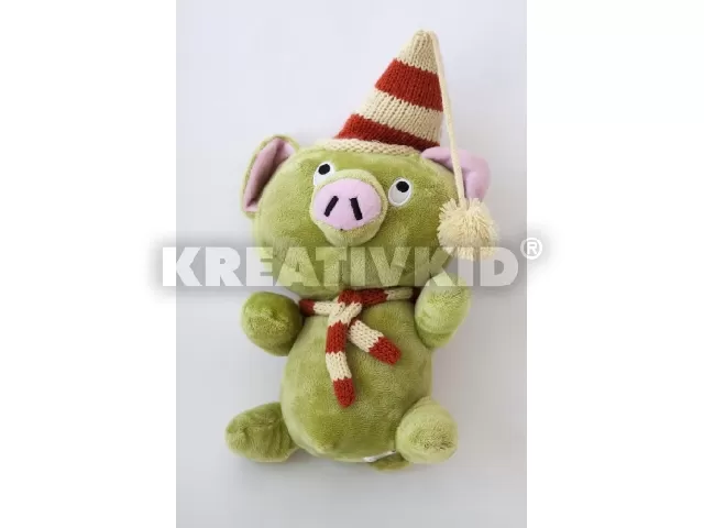 Puha, bársonyos tapintású Mazsola plüssfigura kötött sapkával és sállal a Négy International termékkínálatából.