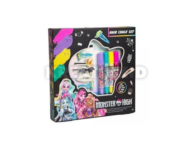 - 4 élénk színű hajkréta- Egyedi Monster High dizájn- Többféle színes hajcsat- Biztonságos és könnyen kimosható kréta
