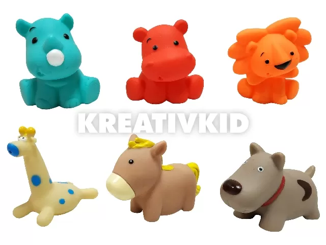 6 db kedves kis állat: orrszarvú, viziló, oroszlán, zsiráf, ló és kutya. Ideális babajátékok, mert kényelmesen beleférnek egy baba kezébe, mert kellemes lekerekített formájuk miatt fogásuk biztonságos, épp annyi ingert tartogatnak a kicsiknek, amennyi még kényelmesen befogadható, hiszen a fürdés önmagában is izgalmas és ingerekben gazdag élmény. A kedves figurák hozzájárulnak a szem-kéz koordináció és a finommotorika fejlesztéséhez és remek kiegészítői lesznek a fürdőszobai szerepjátékoknak is, hogy még szórakoztatóbb és könnyedebb legyen az esti rituálé. Vajon nálatok melyik figura lesz a kedvenc?